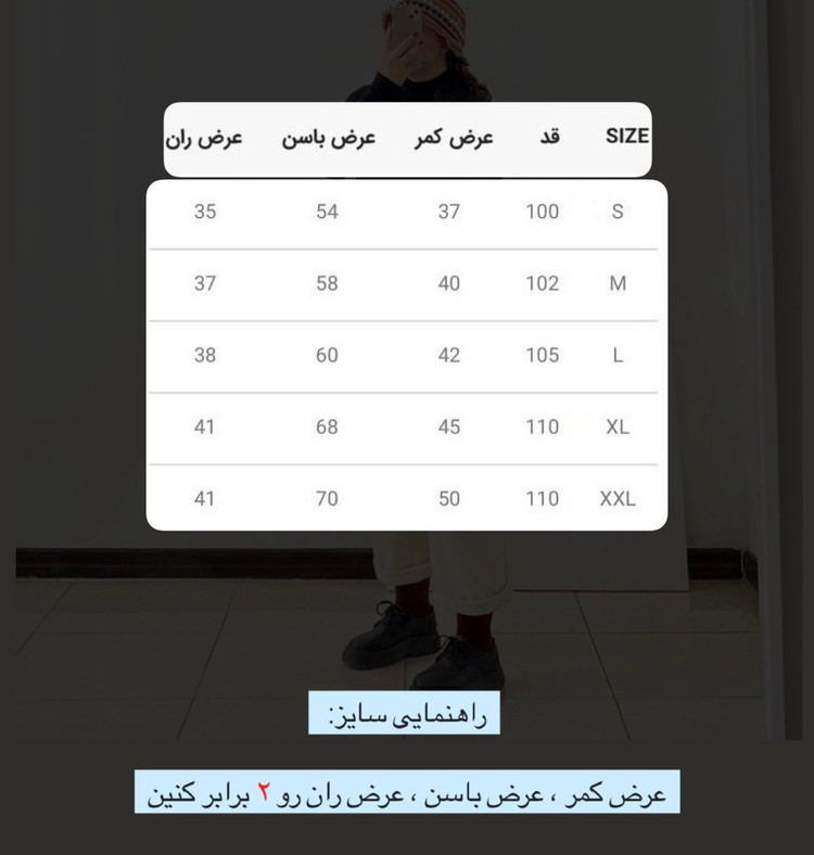 به طور مثال سایز S عرض کمر آن ۳۷ است؛ پس دور کمر 74 میباشد.